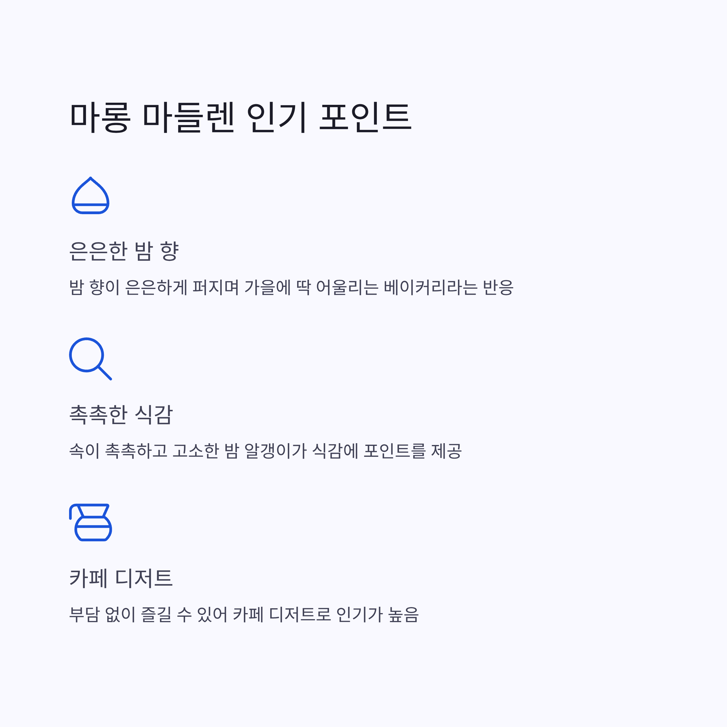 밤 향이 은은하게 퍼지고, 속이 촉촉해 가을에 딱 어울리는 베이커리라는 반응입니다. 고소한 밤 알갱이가 식감에 포인트를 주며, 부담 없이 즐길 수 있어 카페 디저트로 인기가 높습니다.