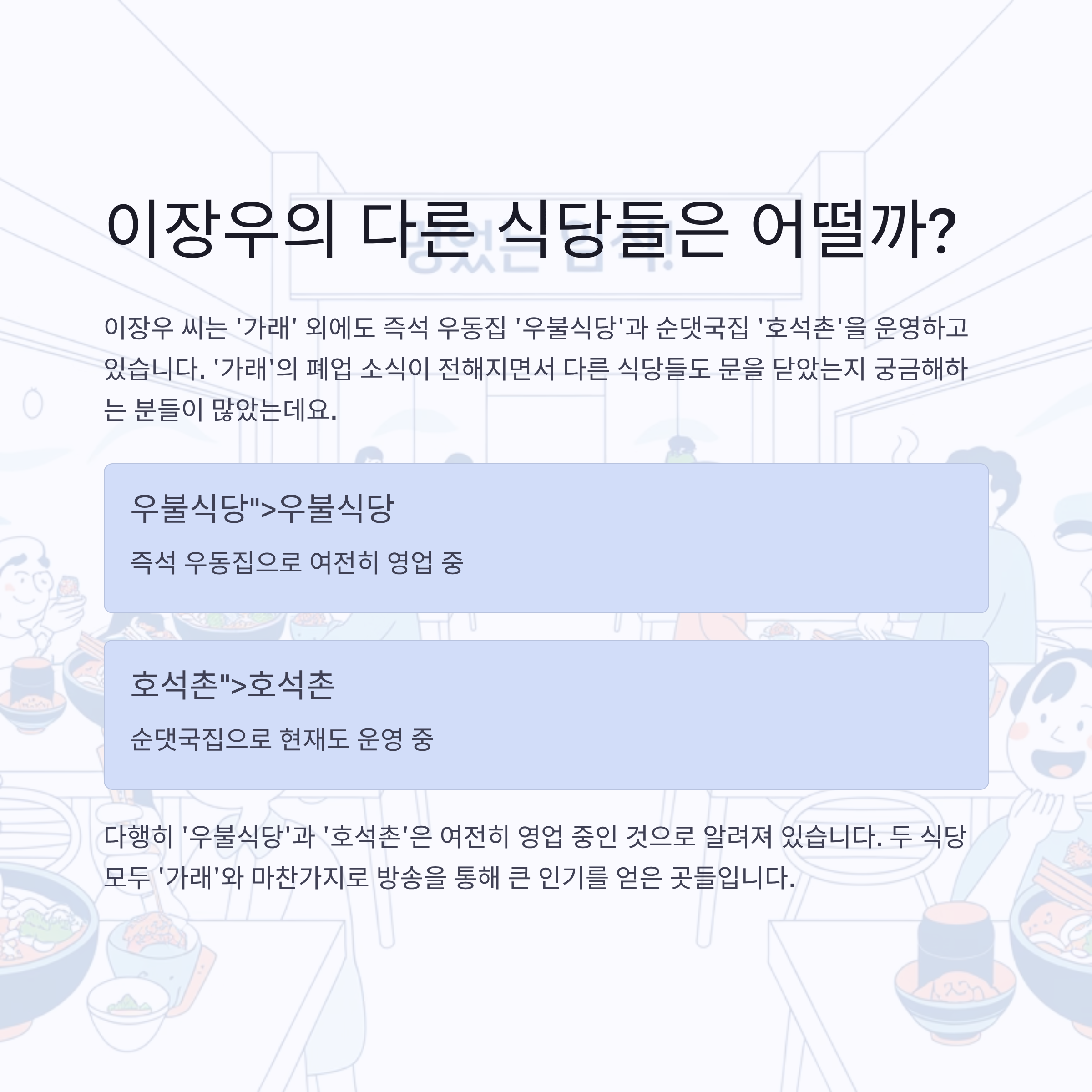 이장우 씨는 '가래' 외에도 즉석 우동집 '우불식당'과 순댓국집 '호석촌'을 운영하고 있습니다. '가래'의 폐업 소식이 전해지면서 다른 식당들도 문을 닫았는지 궁금해하는 분들이 많았는데요. 다행히 '우불식당'과 '호석촌'은 여전히 영업 중인 것으로 알려져 있습니다. 두 식당 모두 '가래'와 마찬가지로 방송을 통해 큰 인기를 얻은 곳들입니다.
