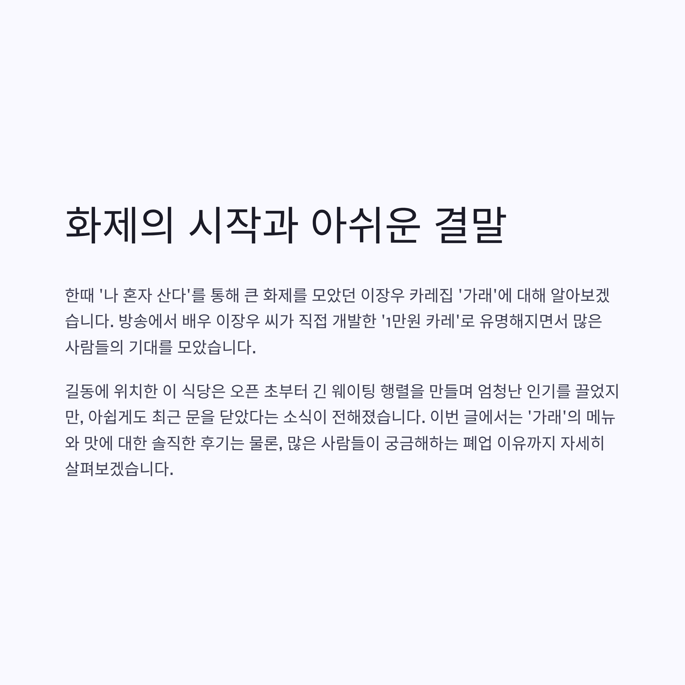 안녕하세요. 한때 나 혼자 산다를 통해 큰 화제를 모았던 이장우 카레집 '가래'에 대해 알아보려고 합니다. 방송에서 배우 이장우 씨가 직접 개발한 '1만원 카레'로 유명해지면서 많은 사람들의 기대를 모았는데요. 길동에 위치한 이 식당은 오픈 초부터 긴 웨이팅 행렬을 만들며 엄청난 인기를 끌었습니다. 하지만 아쉽게도 최근 문을 닫았다는 소식이 전해지면서 그 이유에 대해 궁금해하는 분들이 많습니다. 이번 글에서는 '가래'의 메뉴와 맛에 대한 솔직한 후기는 물론, 많은 사람들이 궁금해하는 폐업 이유까지 자세히 살펴보겠습니다.