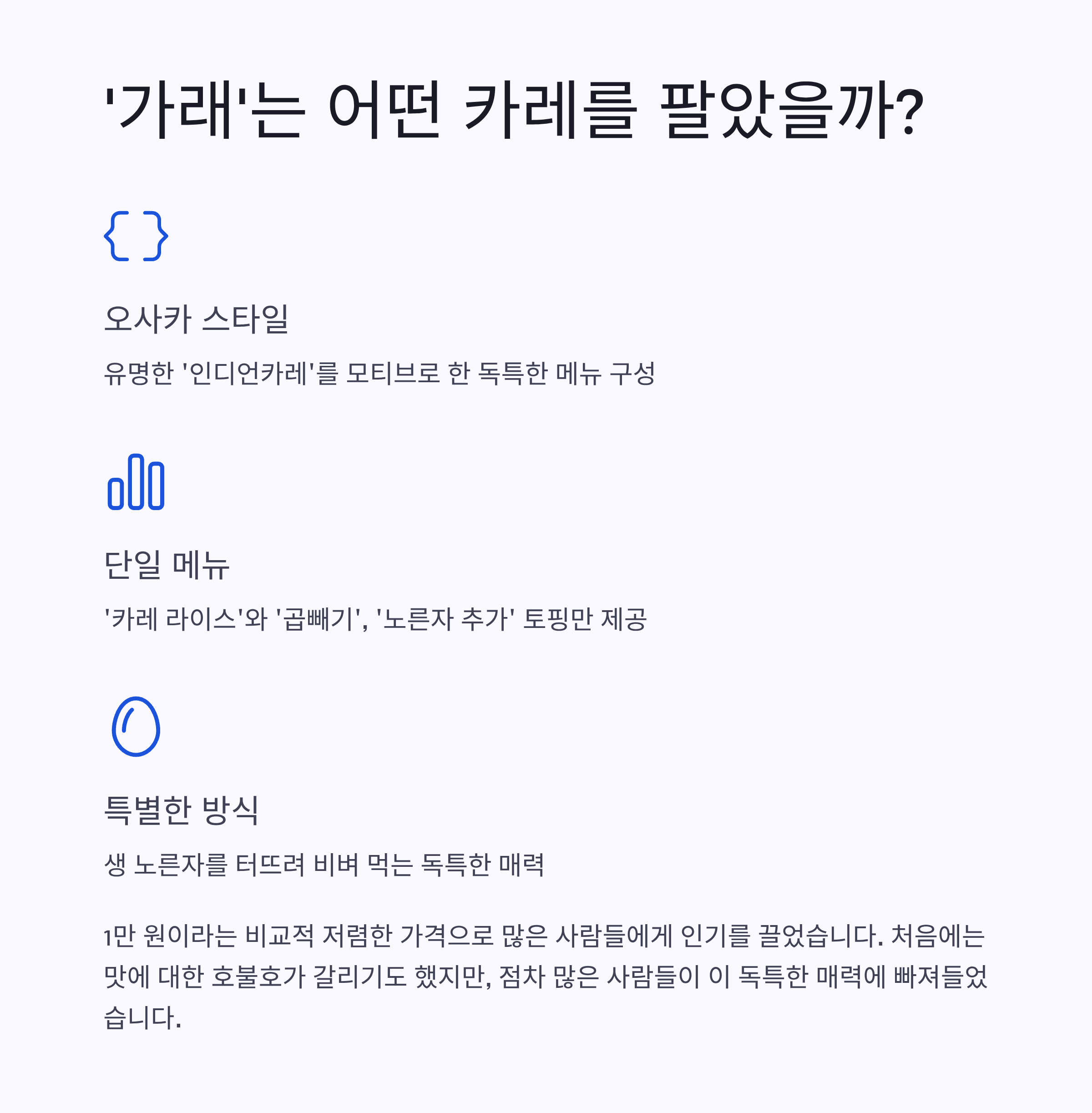 이장우 씨의 카레집 '가래'는 오사카 지역의 유명한 카레인 '인디언카레'를 모티브로 한 메뉴를 선보였습니다. 메뉴는 단일 메뉴로 '카레 라이스'와 '곱빼기', 그리고 '노른자 추가'와 같은 간단한 토핑만 제공했습니다. 1만 원이라는 비교적 저렴한 가격으로 많은 사람들에게 인기를 끌었죠. 이 카레는 밥 위에 카레 소스를 얹고 그 위에 생 노른자를 톡 터뜨려 비벼 먹는 독특한 방식이 특징이었습니다. 처음에는 맛에 대한 호불호가 갈리기도 했지만, 점차 많은 사람들이 이 독특한 매력에 빠져들었습니다.
