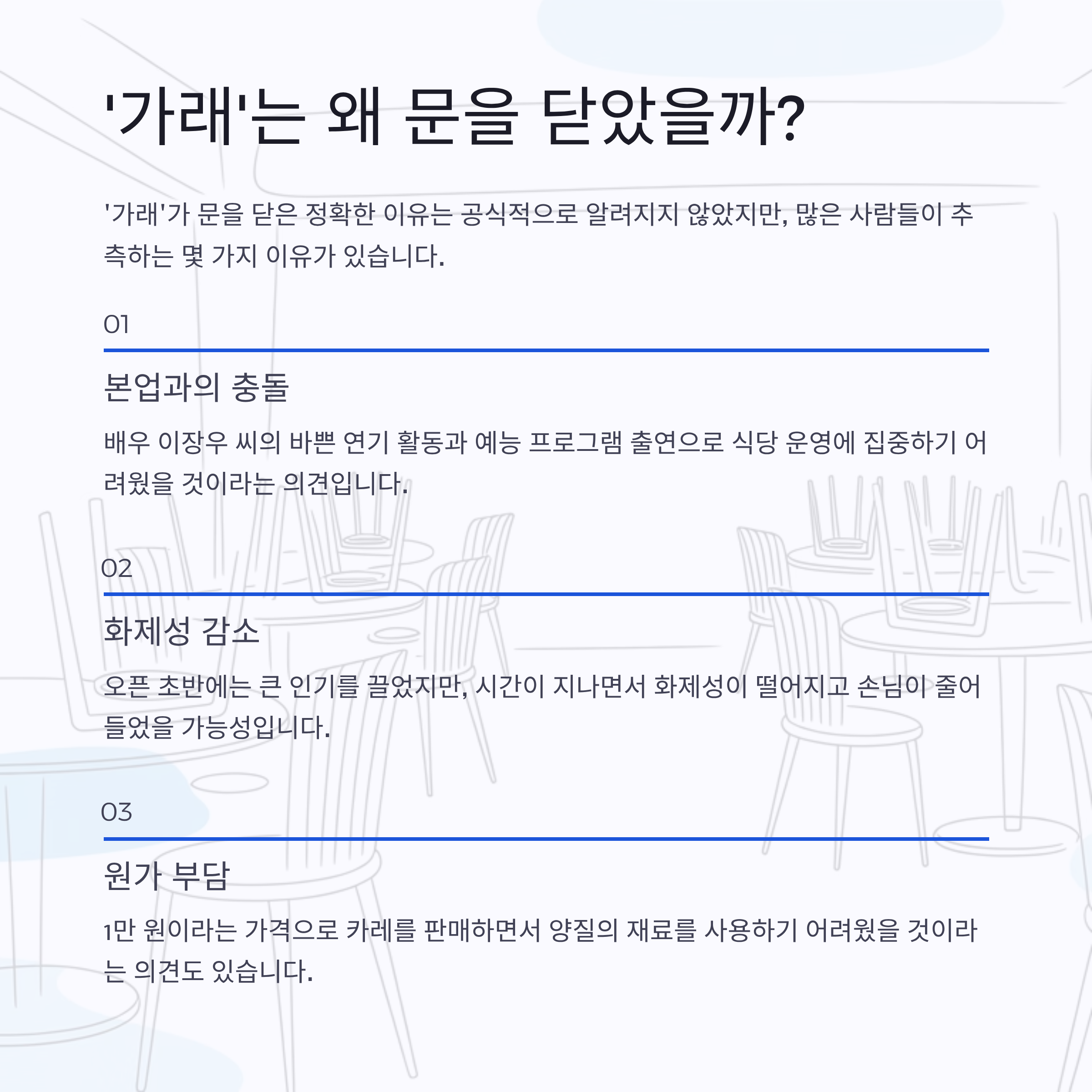 첫째, 배우 이장우 씨의 바쁜 본업 때문일 수 있습니다. '가래'는 이장우 씨가 방송 활동을 하면서 동시에 운영했던 곳입니다. 본업인 연기 활동과 여러 예능 프로그램 출연으로 식당 운영에 집중하기 어려웠을 것이라는 의견입니다.