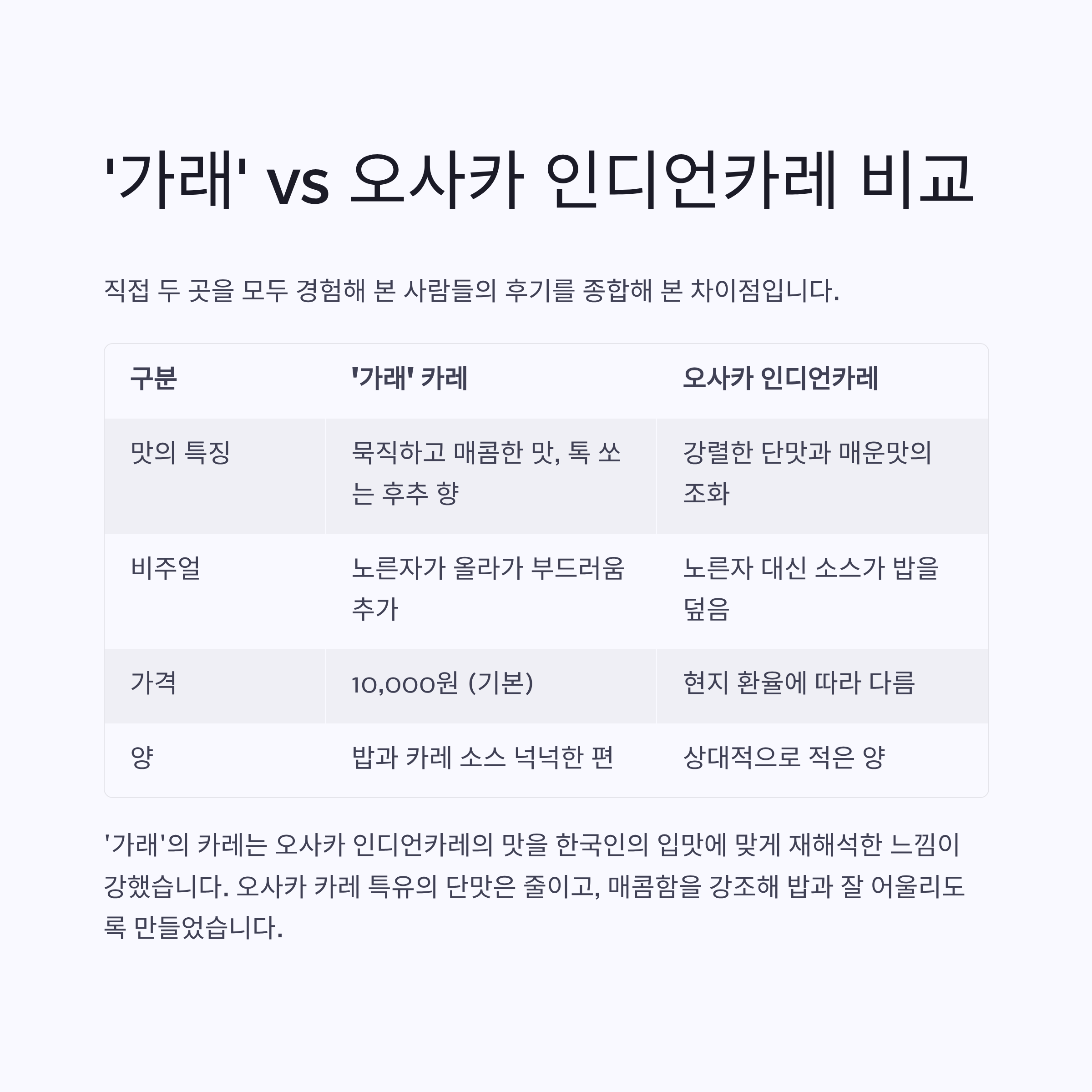 많은 사람들이 '가래'의 카레가 오사카의 인디언카레와 얼마나 비슷한지 궁금해했는데요. 직접 두 곳을 모두 경험해 본 사람들의 후기를 종합해 보면 다음과 같은 차이점을 알 수 있습니다.