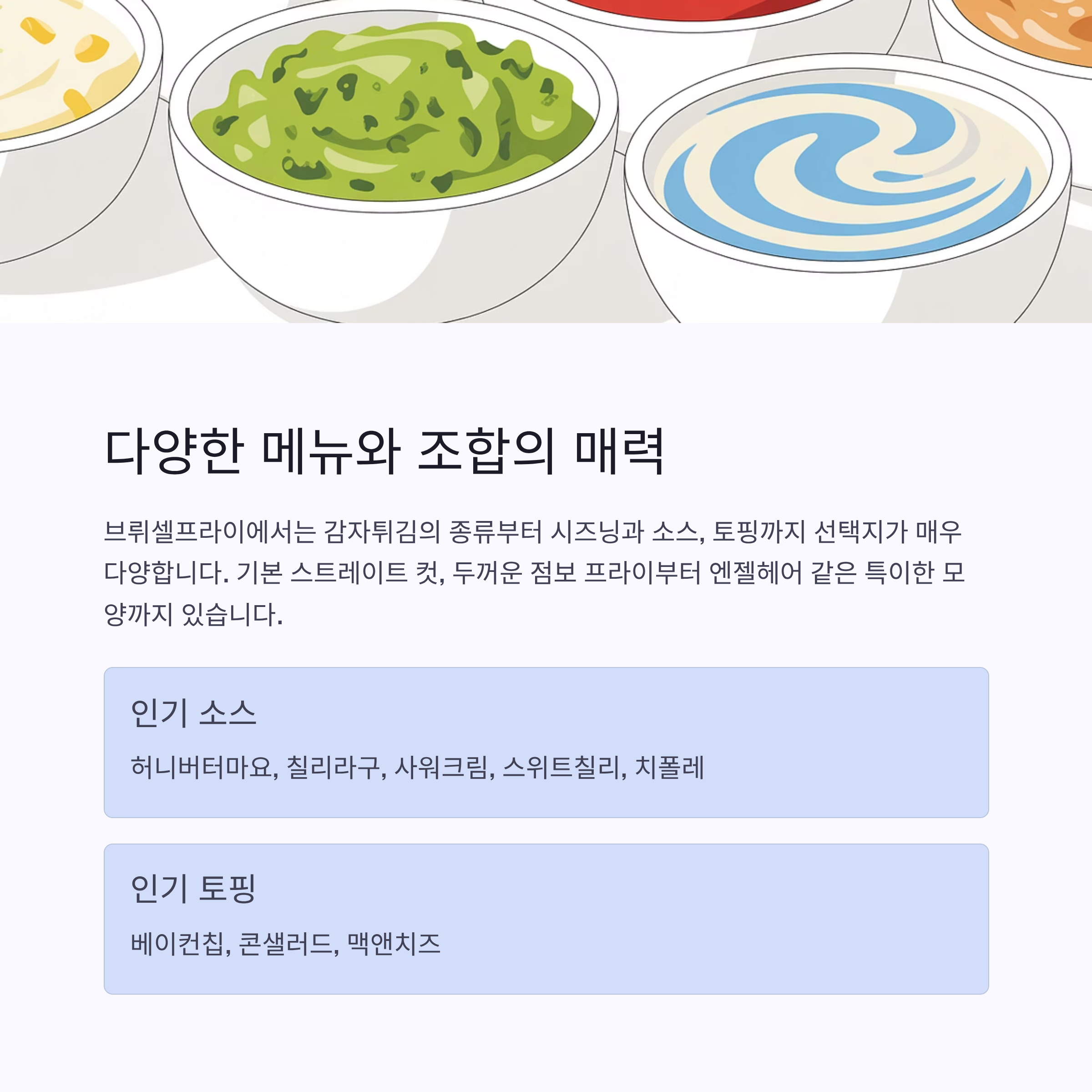 브뤼셀프라이에서는 감자튀김의 종류부터 시즈닝과 소스, 토핑까지 선택지가 매우 다양합니다. 기본 스트레이트 컷, 두꺼운 점보 프라이부터 엔젤헤어 같은 특이한 모양까지 있습니다. 인기 소스로는 허니버터마요, 칠리라구, 사워크림, 스위트칠리, 치폴레 등이 있으며, 토핑으로 베이컨칩, 콘샐러드, 맥앤치즈 등이 사랑받습니다.
