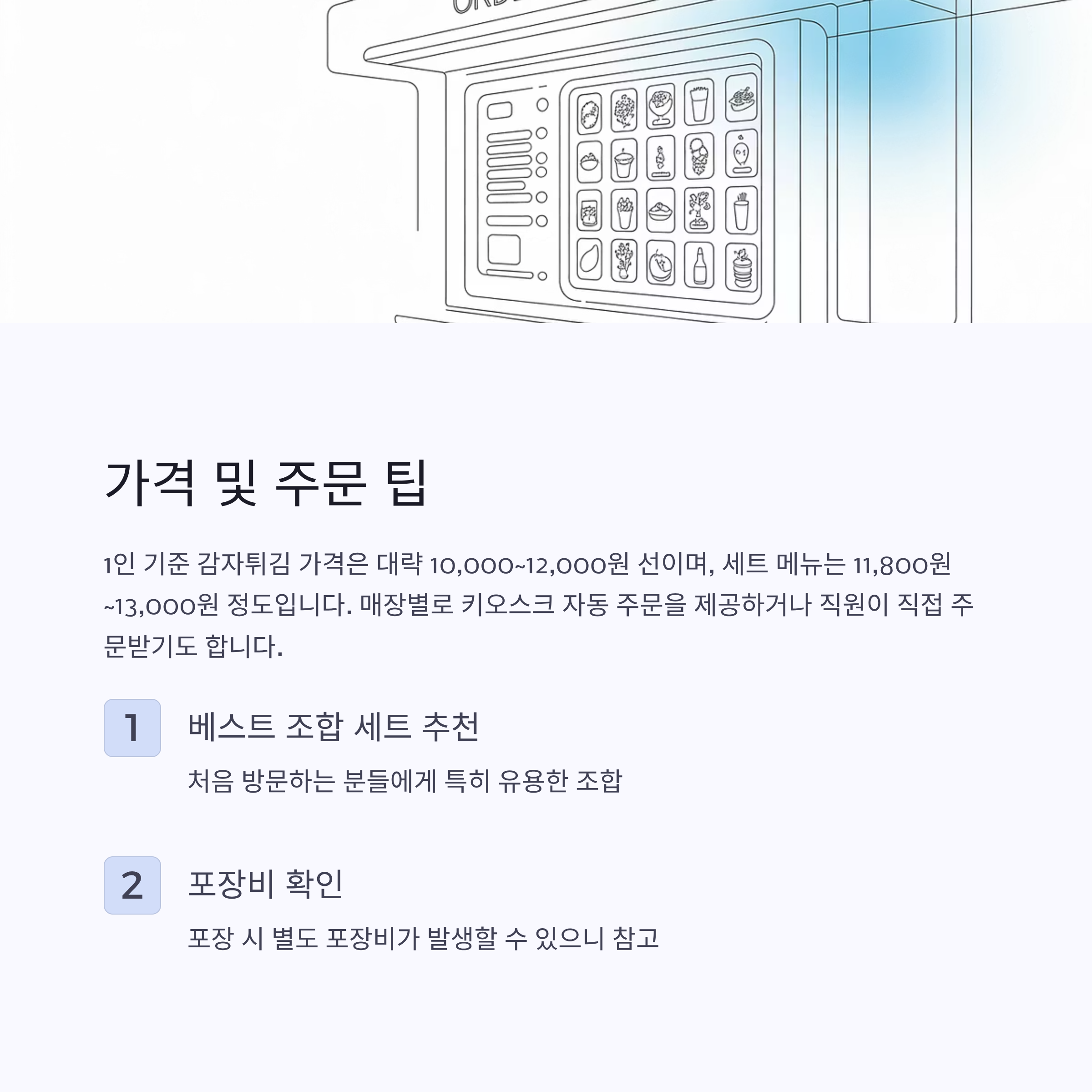 1인 기준 감자튀김 가격은 대략 10,000~12,000원 선이며, 세트 메뉴는 11,800원~13,000원 정도입니다.