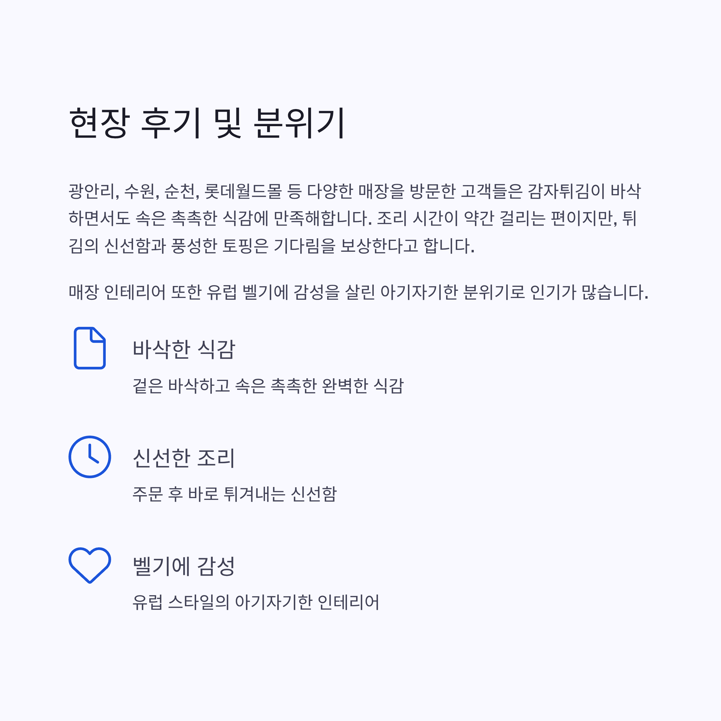 광안리, 수원, 순천, 롯데월드몰 등 다양한 매장을 방문한 고객들은 감자튀김이 바삭하면서도 속은 촉촉한 식감에 만족해합니다. 조리 시간이 약간 걸리는 편이지만, 튀김의 신선함과 풍성한 토핑은 기다림을 보상한다고 합니다. 매장 인테리어 또한 유럽 벨기에 감성을 살린 아기자기한 분위기로 인기가 많습니다.