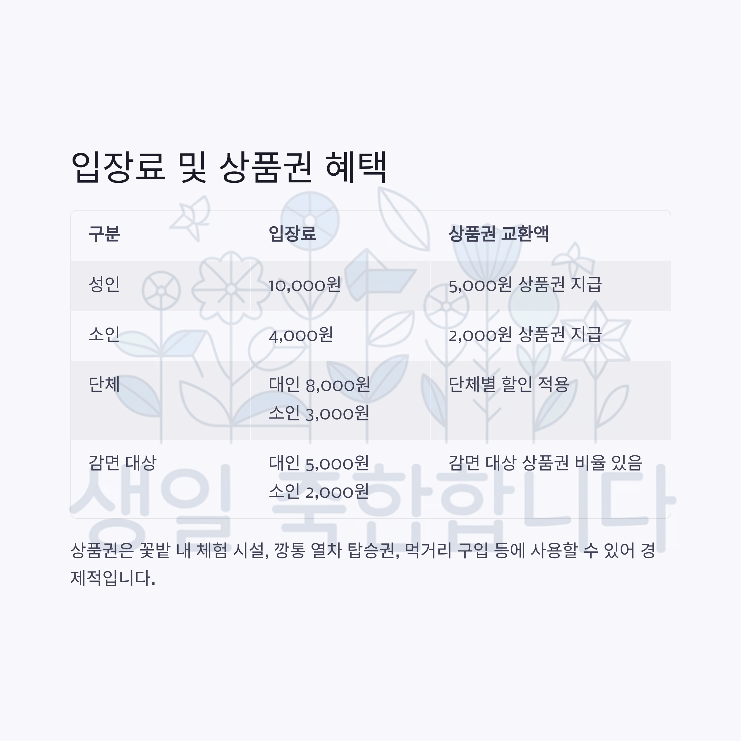 상품권은 꽃밭 내 체험 시설, 깡통 열차 탑승권, 먹거리 구입 등에 사용할 수 있어 경제적입니다.