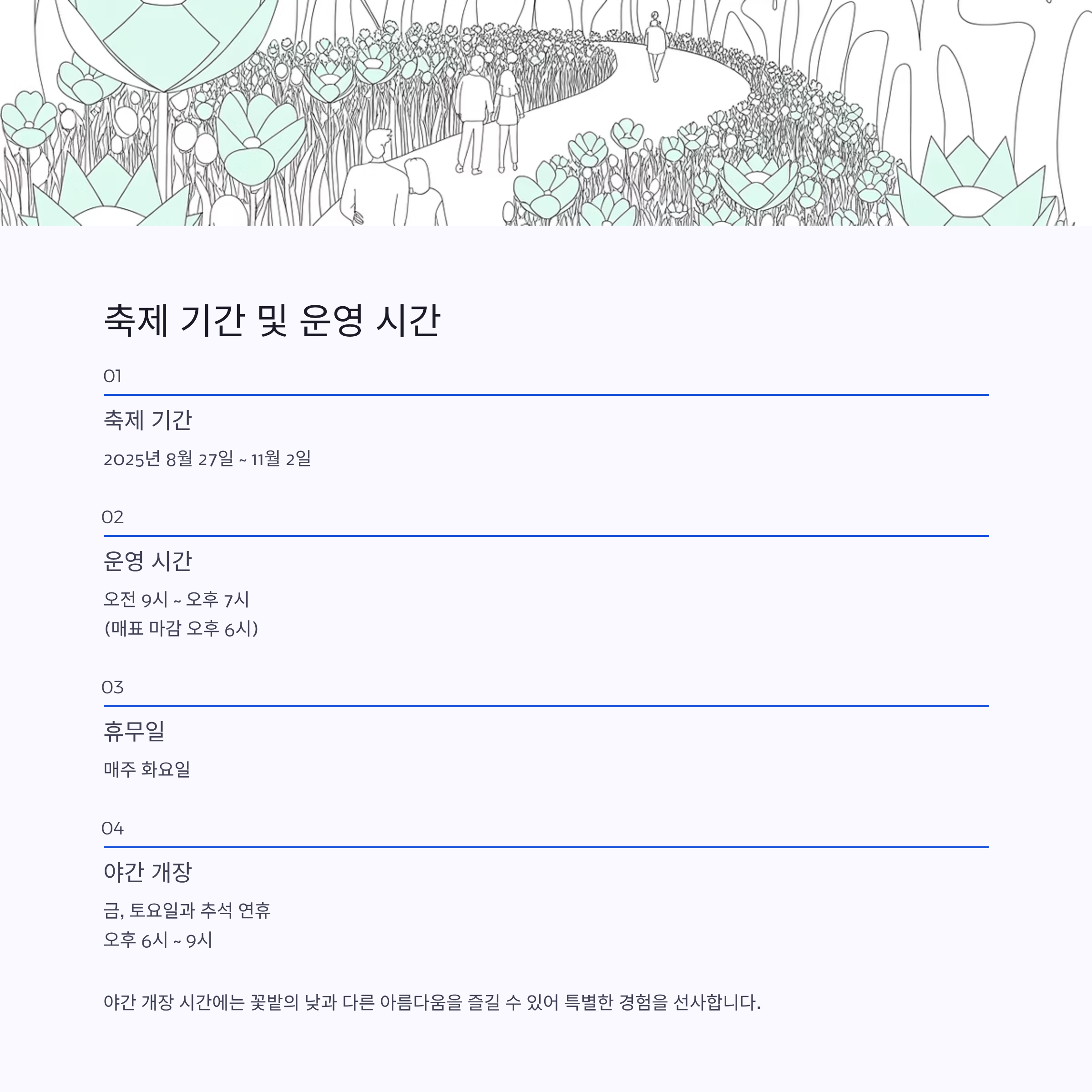야간 개장도 금, 토요일과 추석 연휴 기간 중 운영되어 오후 6시부터 9시까지 꽃밭의 낮과 다른 아름다움을 즐길 수 있습니다.