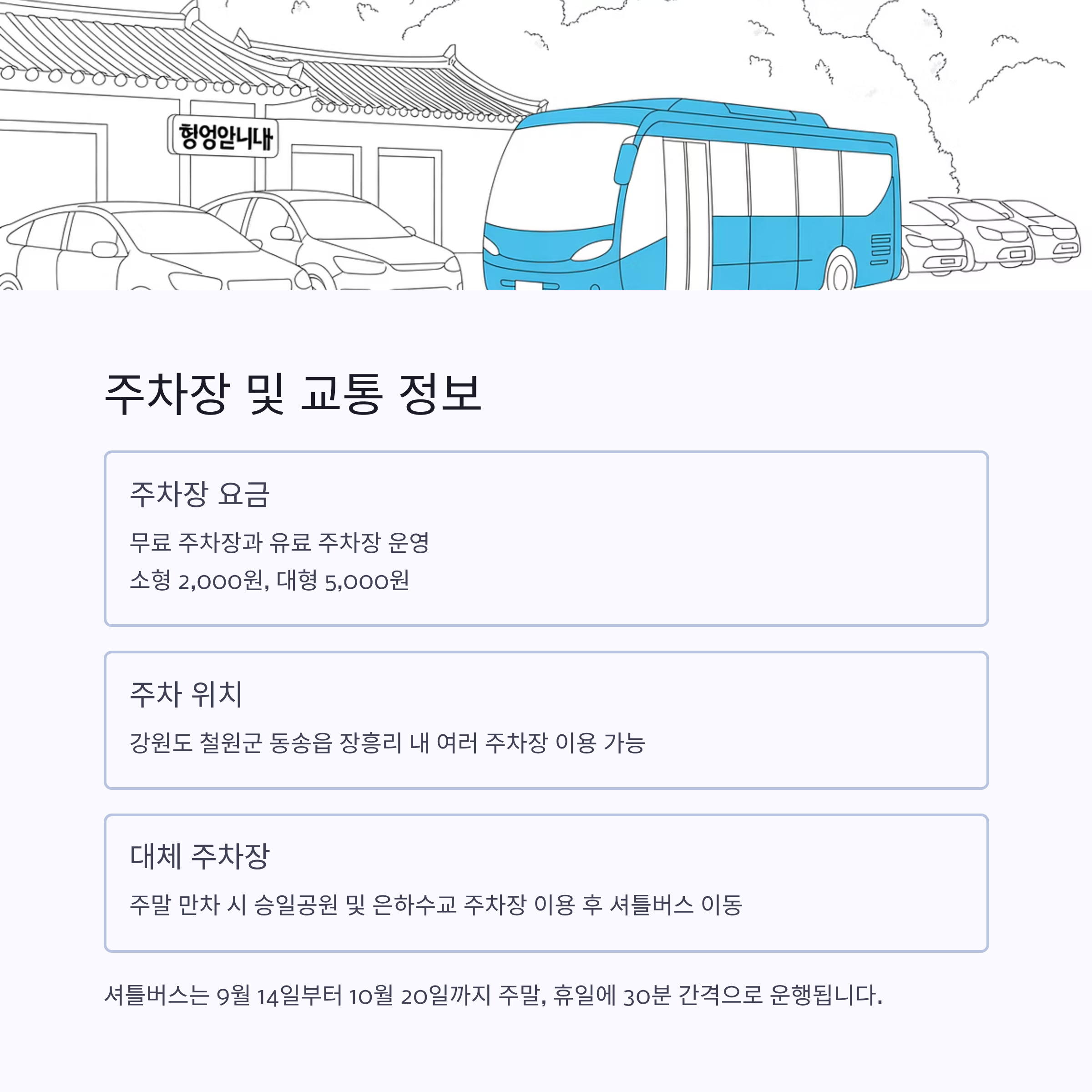 - 주차 위치: 강원도 철원군 동송읍 장흥리 내 여러 주차장 이용 가능