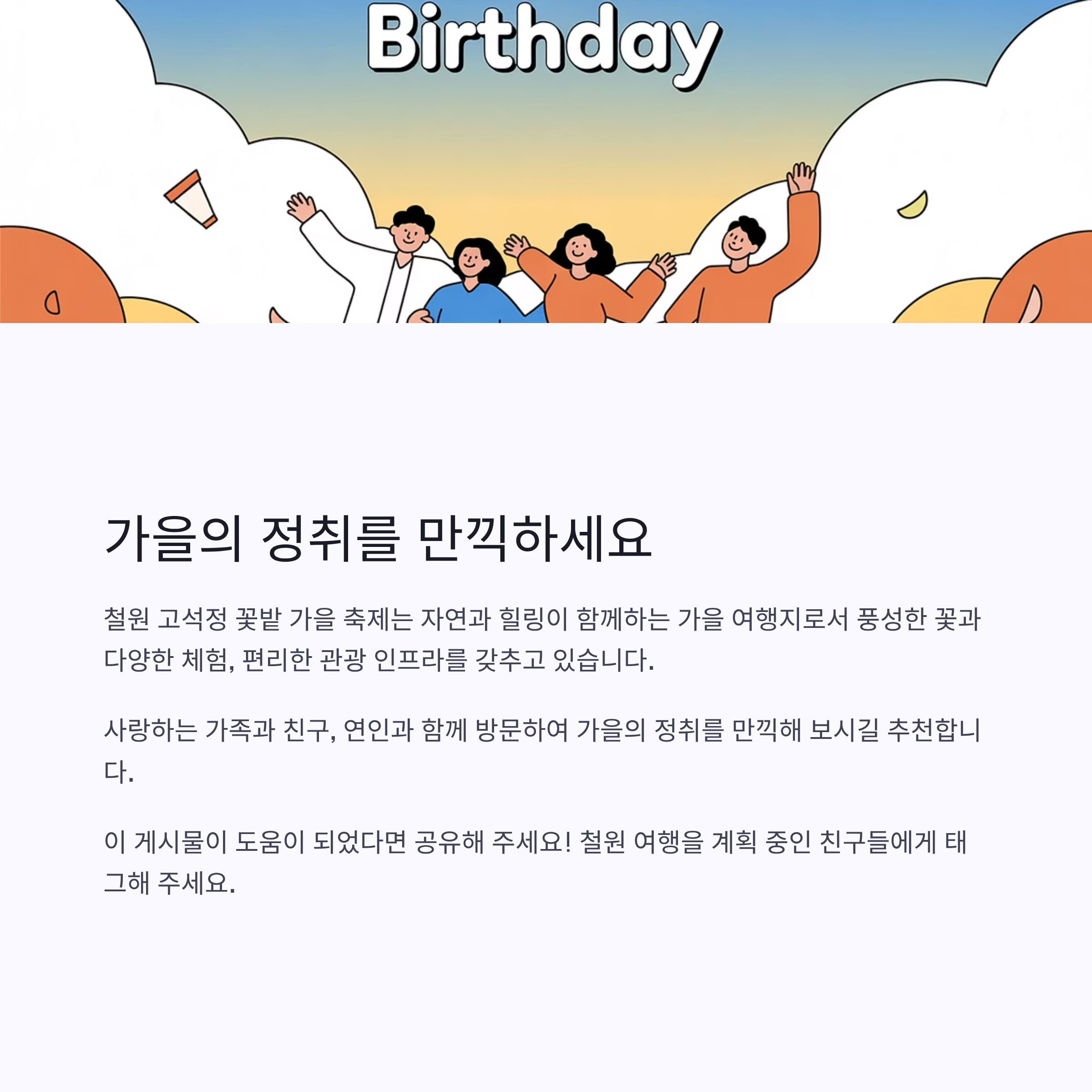 철원 고석정 꽃밭 가을 축제는 자연과 힐링이 함께하는 가을 여행지로서 풍성한 꽃과 다양한 체험, 편리한 관광 인프라를 갖추고 있습니다. 사랑하는 가족과 친구, 연인과 함께 방문하여 가을의 정취를 만끽해 보시길 추천합니다.