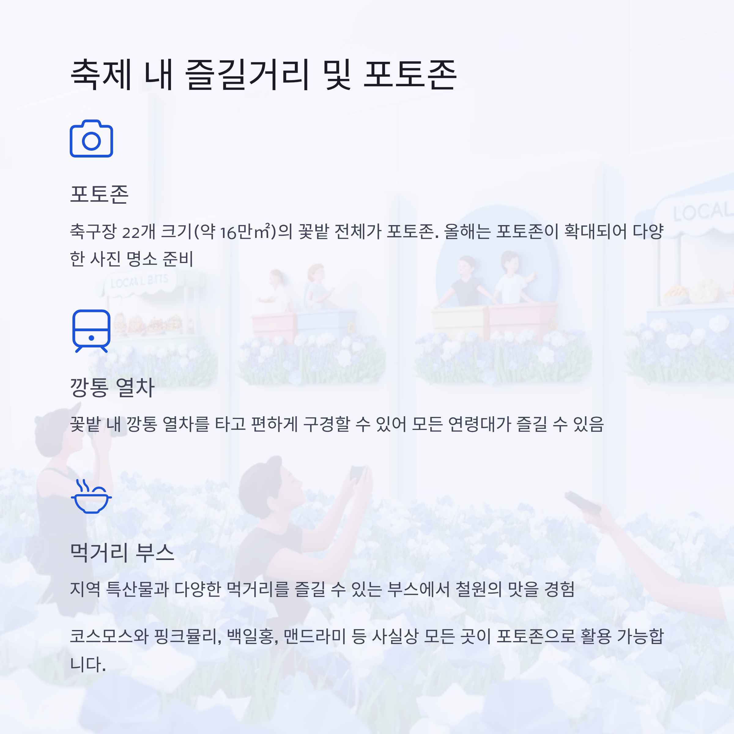 또한, 꽃밭 내 깡통 열차를 타고 편하게 구경하거나 먹거리 부스에서 지역 특산물도 즐길 수 있습니다.