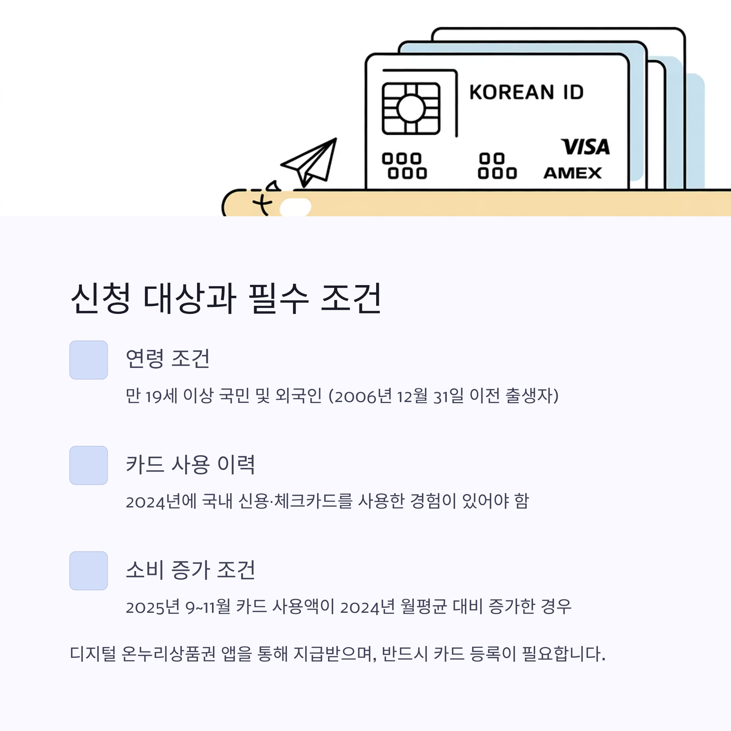 2025년 상생페이백은 카드 소비가 늘어난 모든 국민에게 누구나 신청 기회가 주어지는 유용한 혜택입니다. 온라인 누리집에서 쉽게 신청하시고, 카드 사용 내용 확인과 예상 금액 조회를 통해 최대 환급받는 기회를 꼭 챙기시기 바랍니다.