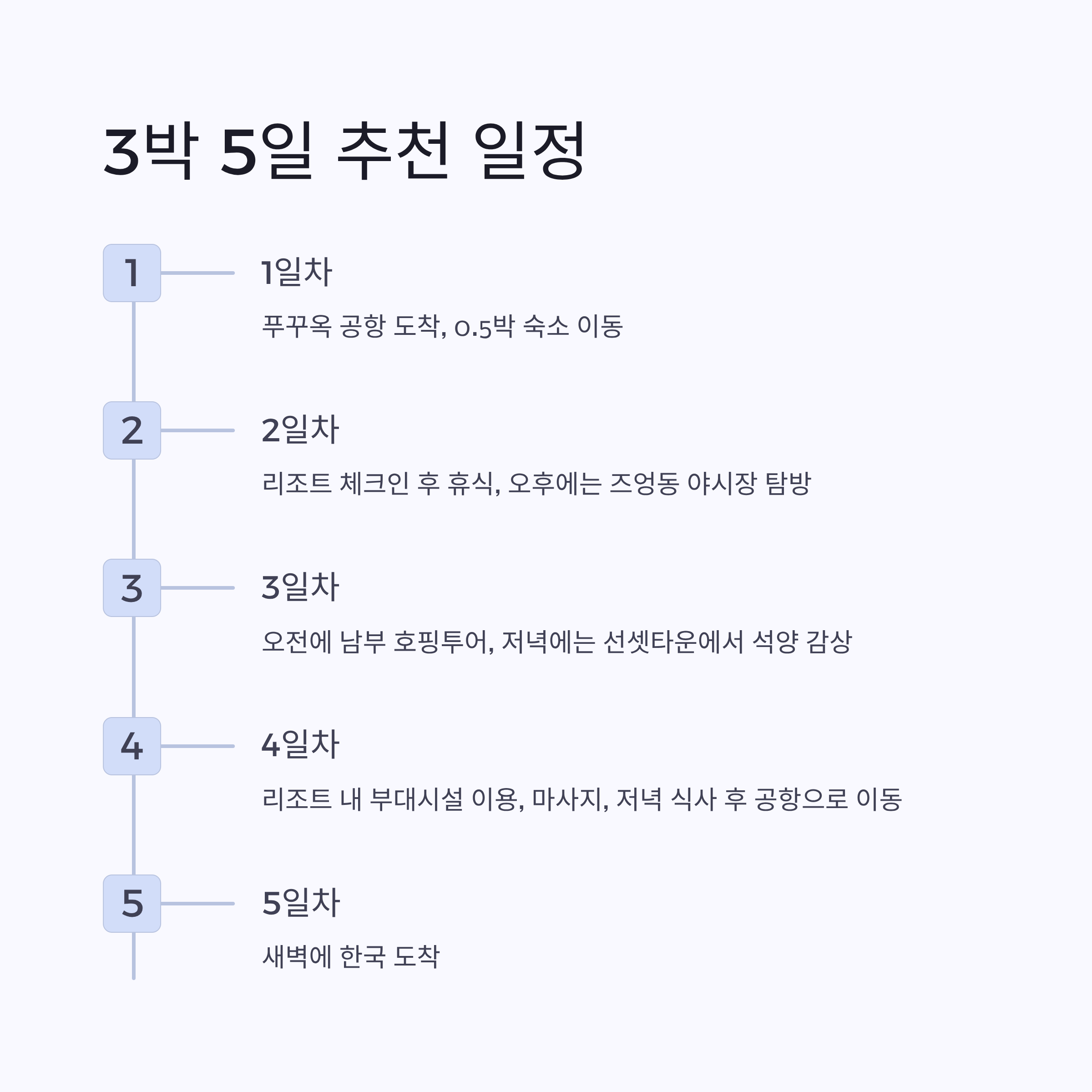 3박 5일 푸꾸옥 여행 추천 일정입니다. 첫날은 늦은 밤 도착이 많으니 공항 근처 숙소에서 0.5박을 보내는 것을 추천합니다. 첫째 날: 푸꾸옥 공항 도착, 0.5박 숙소 이동 둘째 날: 리조트 체크인 후 휴식, 오후에는 즈엉동 야시장 탐방 셋째 날: 오전에 남부 호핑투어, 저녁에는 선셋타운에서 석양 감상 넷째 날: 리조트 내 부대시설 이용, 마사지, 저녁 식사 후 공항으로 이동 다섯째 날: 새벽에 한국 도착
