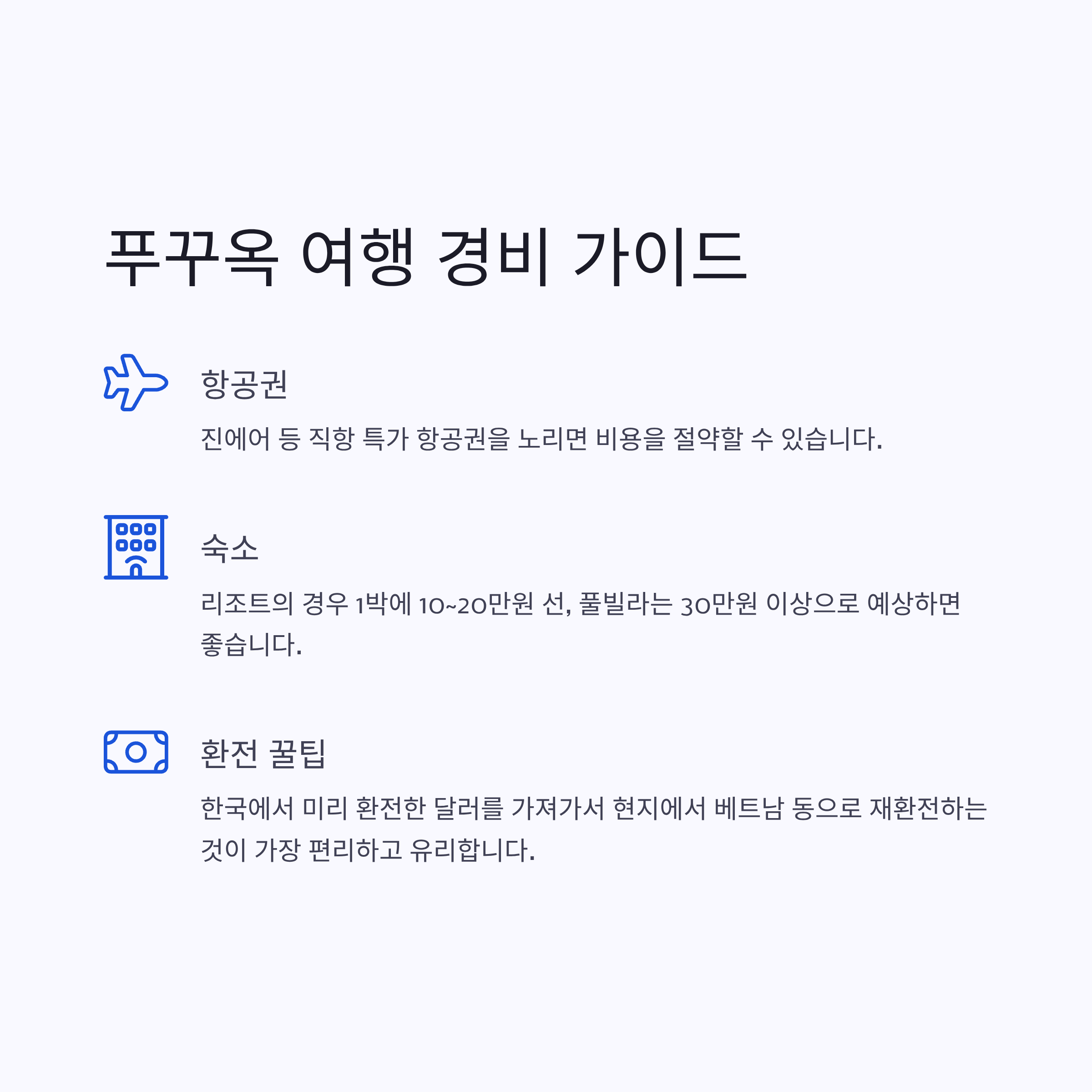 푸꾸옥 여행 경비는 항공권과 숙소에 따라 크게 달라집니다. 항공권은 진에어 등 직항 특가 항공권을 노리면 비용을 절약할 수 있습니다. 숙소는 리조트의 경우 1박에 10~20만원 선, 풀빌라는 30만원 이상으로 예상하면 좋습니다. 베트남 현지에서는 한국에서 미리 환전한 달러를 가져가서 현지에서 베트남 동으로 재환전하는 것이 가장 편리하고 유리합니다.