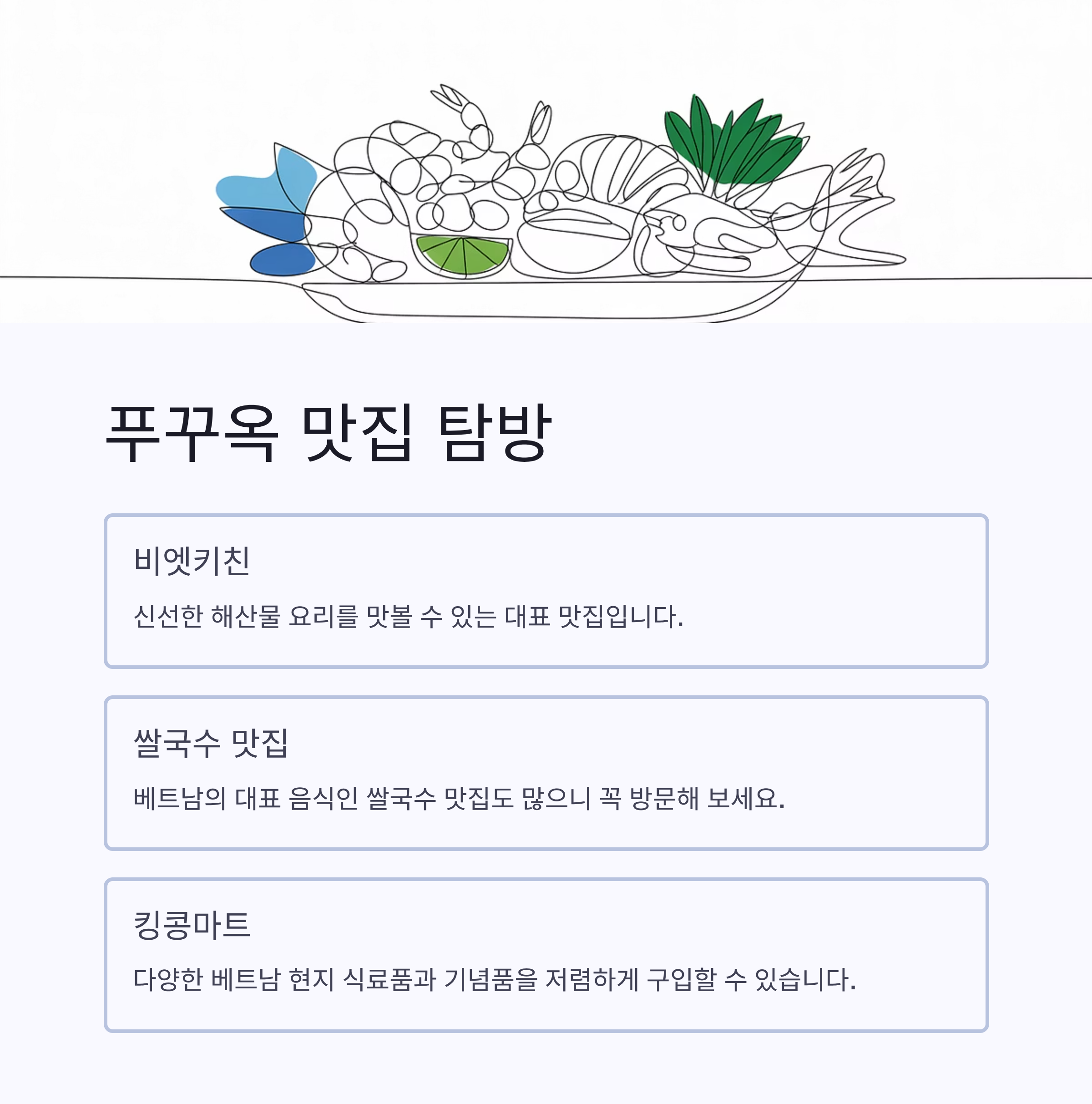 푸꾸옥에는 신선한 해산물 요리를 맛볼 수 있는 비엣키친 같은 맛집들이 있습니다. 또한, 베트남의 대표 음식인 쌀국수 맛집도 많으니 꼭 방문해 보세요. 푸꾸옥 킹콩마트에서는 다양한 베트남 현지 식료품과 기념품을 저렴하게 구입할 수 있습니다.