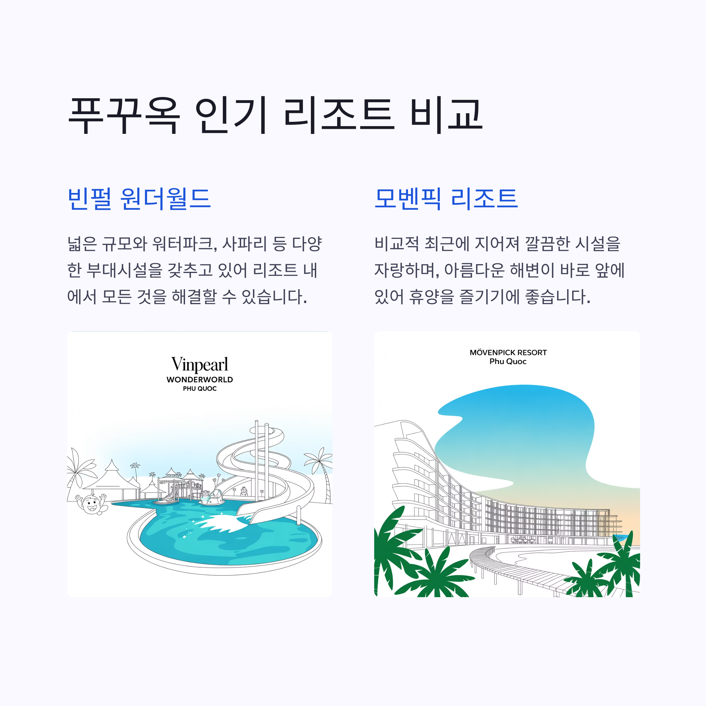 푸꾸옥에는 다양한 리조트가 있습니다. 그중에서도 빈펄 원더월드 리조트와 모벤픽 리조트는 가족 여행객들에게 특히 인기가 많습니다. 빈펄 원더월드는 넓은 규모와 워터파크, 사파리 등 다양한 부대시설을 갖추고 있어 리조트 내에서 모든 것을 해결할 수 있습니다. 모벤픽 리조트는 비교적 최근에 지어져 깔끔한 시설을 자랑하며, 아름다운 해변이 바로 앞에 있어 휴양을 즐기기에 좋습니다.