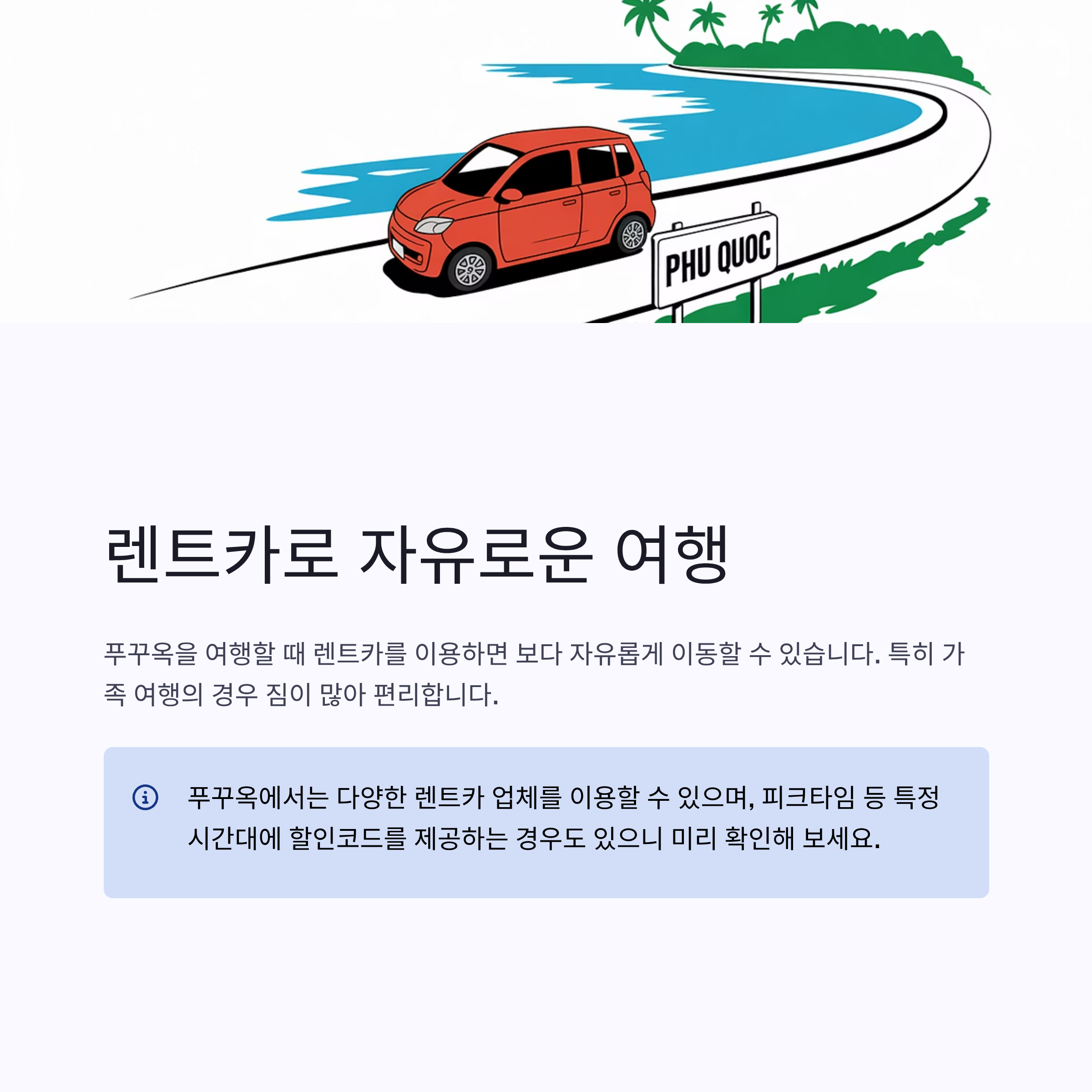 푸꾸옥을 여행할 때 렌트카를 이용하면 보다 자유롭게 이동할 수 있습니다. 특히 가족 여행의 경우 짐이 많아 편리한데요. 푸꾸옥에서는 다양한 렌트카 업체를 이용할 수 있으며, 피크타임 등 특정 시간대에 할인코드를 제공하는 경우도 있으니 미리 확인해 보세요.