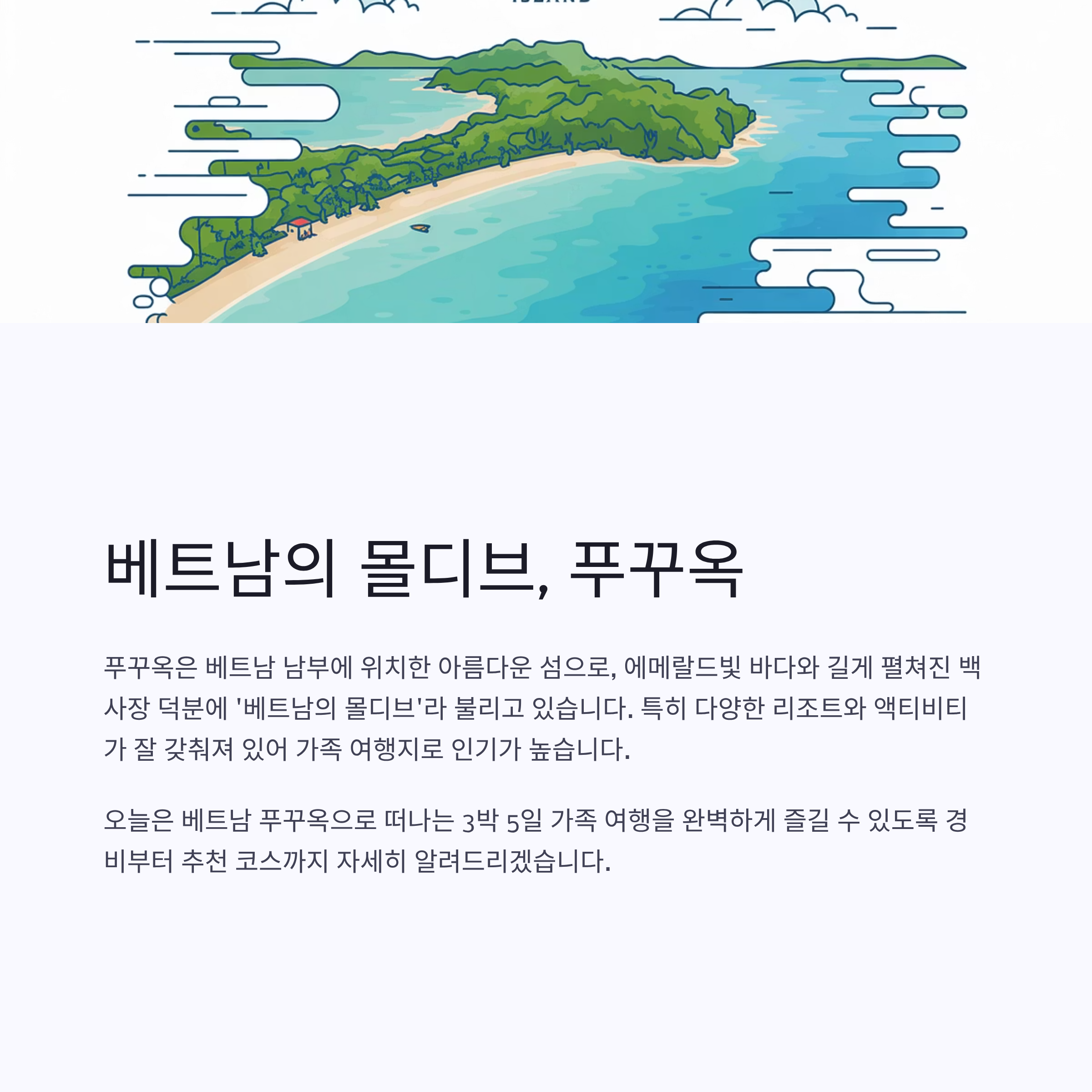푸꾸옥은 베트남 남부에 위치한 아름다운 섬으로, 에메랄드빛 바다와 길게 펼쳐진 백사장 덕분에 '베트남의 몰디브'라 불리고 있습니다. 특히 다양한 리조트와 액티비티가 잘 갖춰져 있어 가족 여행지로 인기가 높은데요. 오늘은 베트남 푸꾸옥으로 떠나는 3박 5일 가족 여행을 완벽하게 즐길 수 있도록 경비부터 추천 코스까지 자세히 알려드리겠습니다.