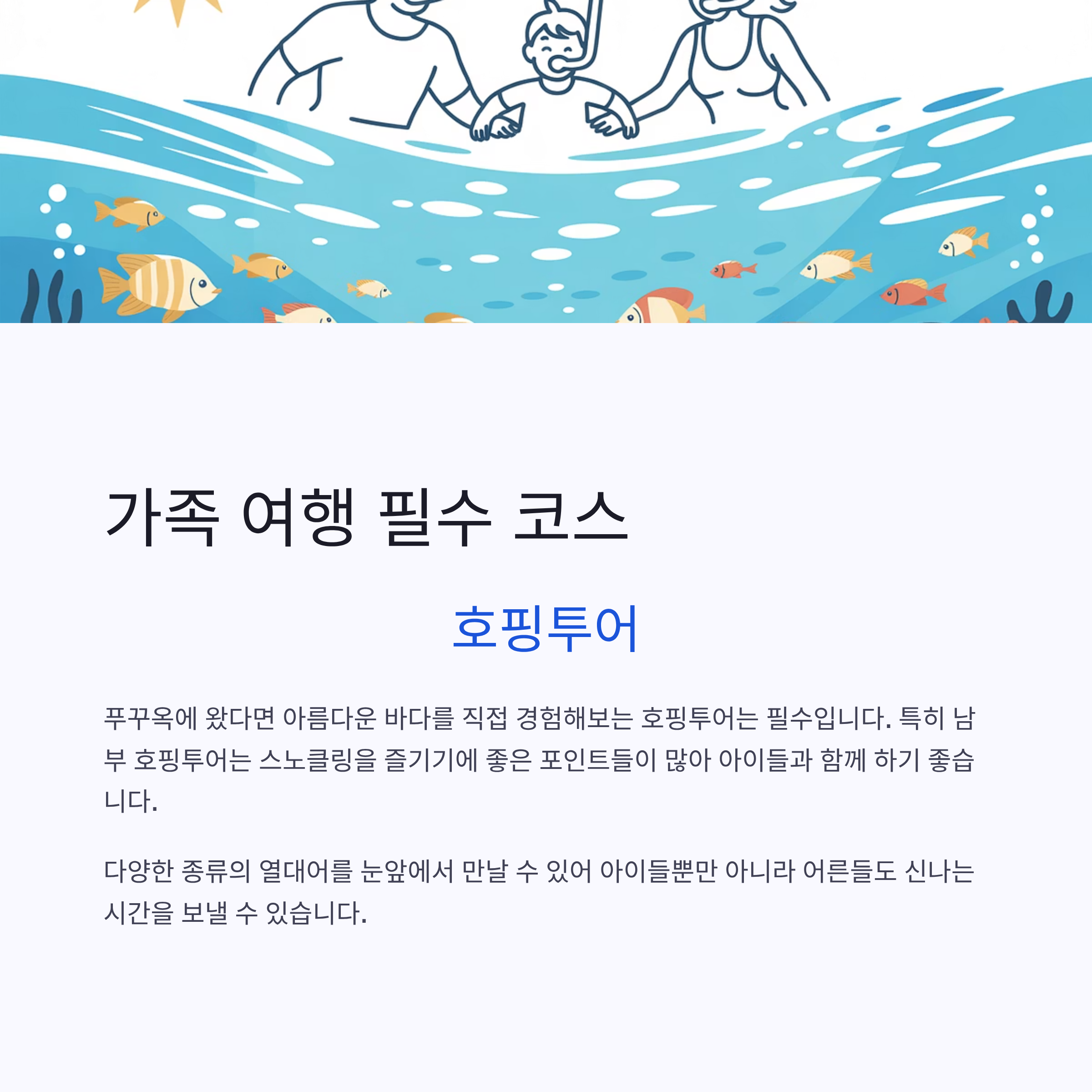 푸꾸옥에 왔다면 아름다운 바다를 직접 경험해보는 호핑투어는 필수입니다. 특히 남부 호핑투어는 스노클링을 즐기기에 좋은 포인트들이 많아 아이들과 함께 하기 좋습니다. 다양한 종류의 열대어를 눈앞에서 만날 수 있어 아이들뿐만 아니라 어른들도 신나는 시간을 보낼 수 있습니다.