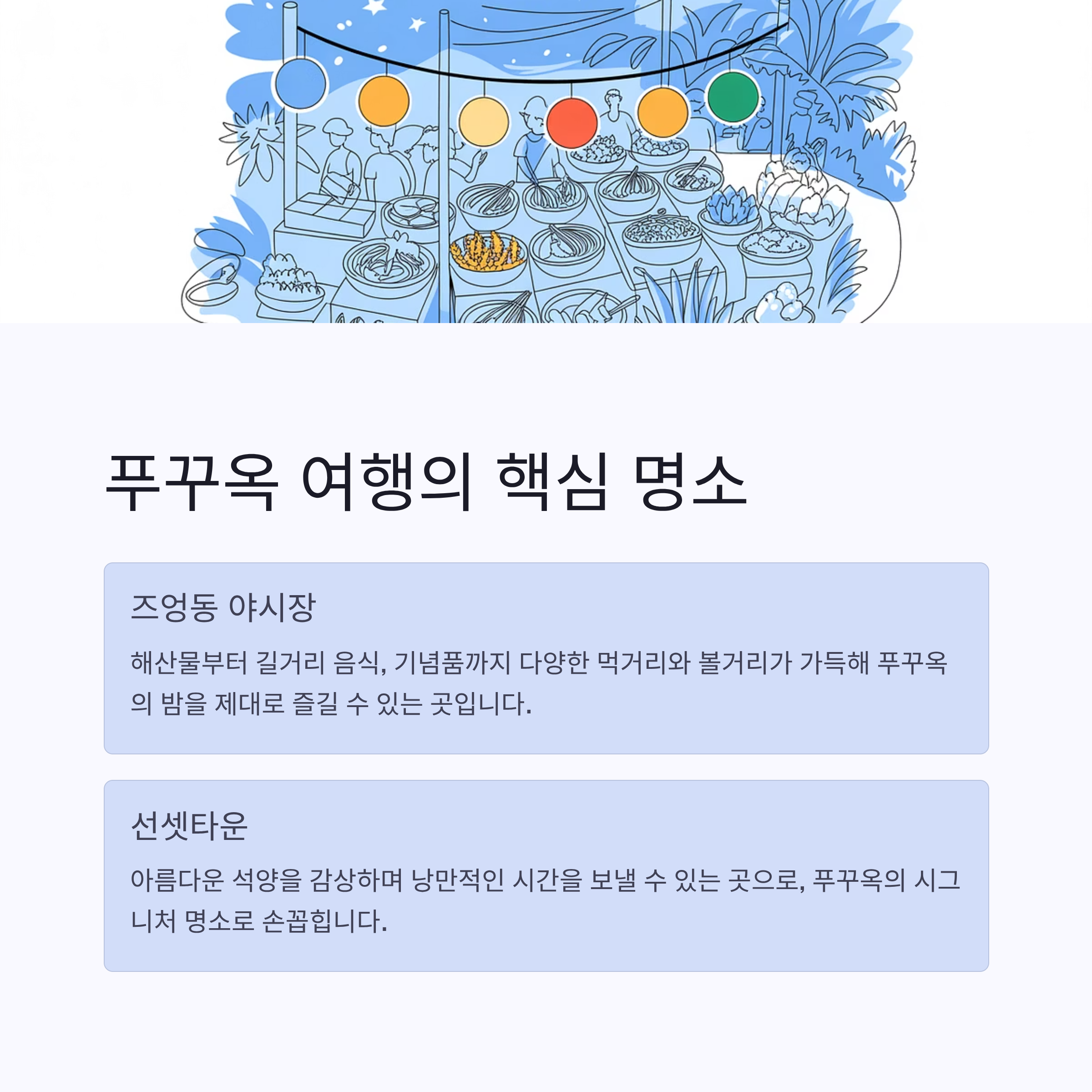 푸꾸옥 여행의 핵심은 바로 즈엉동 야시장과 선셋타운입니다. 즈엉동 야시장은 해산물부터 길거리 음식, 기념품까지 다양한 먹거리와 볼거리가 가득해 푸꾸옥의 밤을 제대로 즐길 수 있는 곳입니다. 선셋타운은 아름다운 석양을 감상하며 낭만적인 시간을 보낼 수 있는 곳으로, 푸꾸옥의 시그니처 명소로 손꼽힙니다.