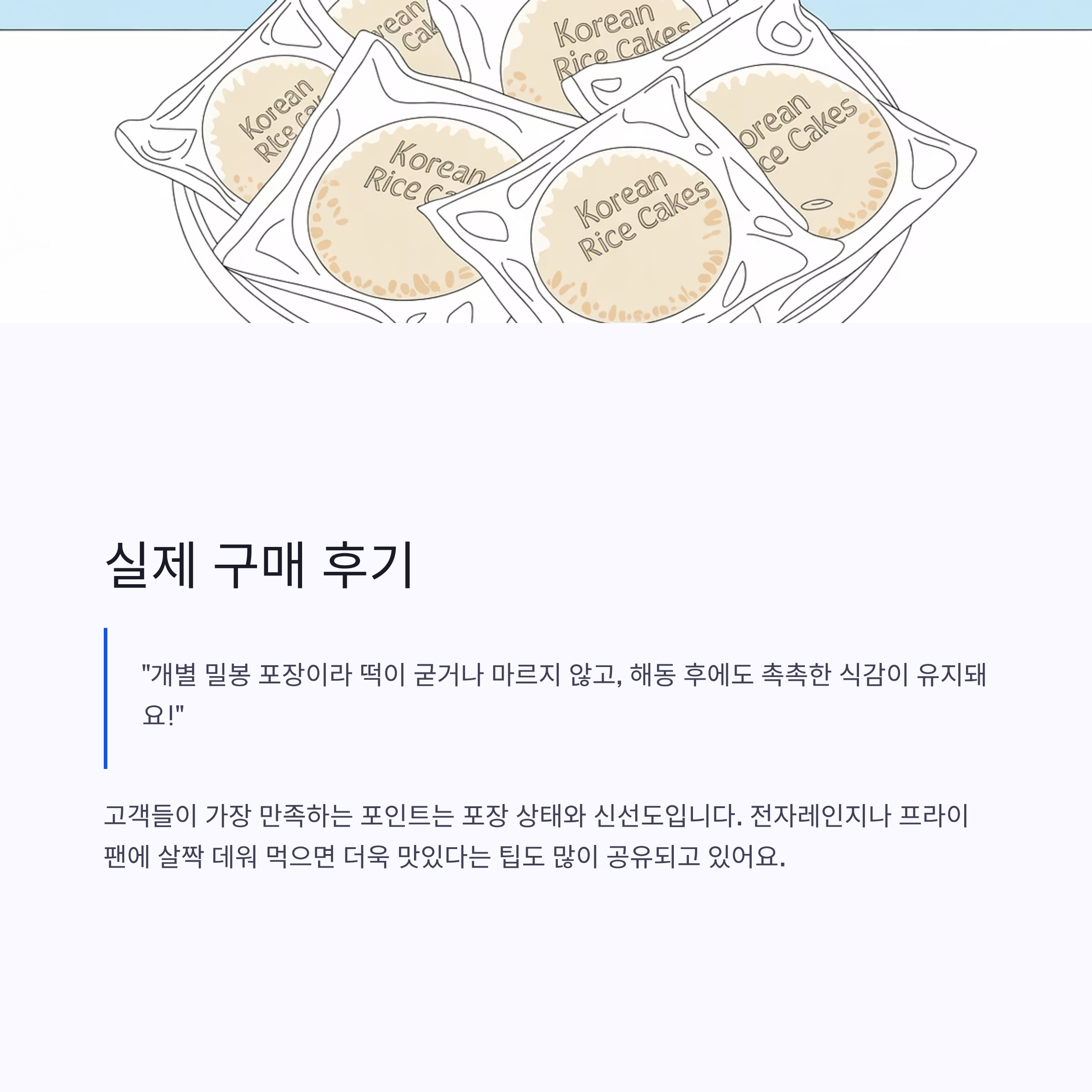 고객들은 포장 상태와 신선도에 만족감을 표합니다. 개별 밀봉 포장이라 떡이 굳거나 마르지 않고, 해동 후에도 촉촉한 식감 유지가 가능하다는 평이 많습니다. 전자레인지나 프라이팬에 살짝 데워 먹으면 더욱 맛있다는 팁도 있습니다. 달지 않고 담백해서 남녀노소 모두 좋아합니다.
