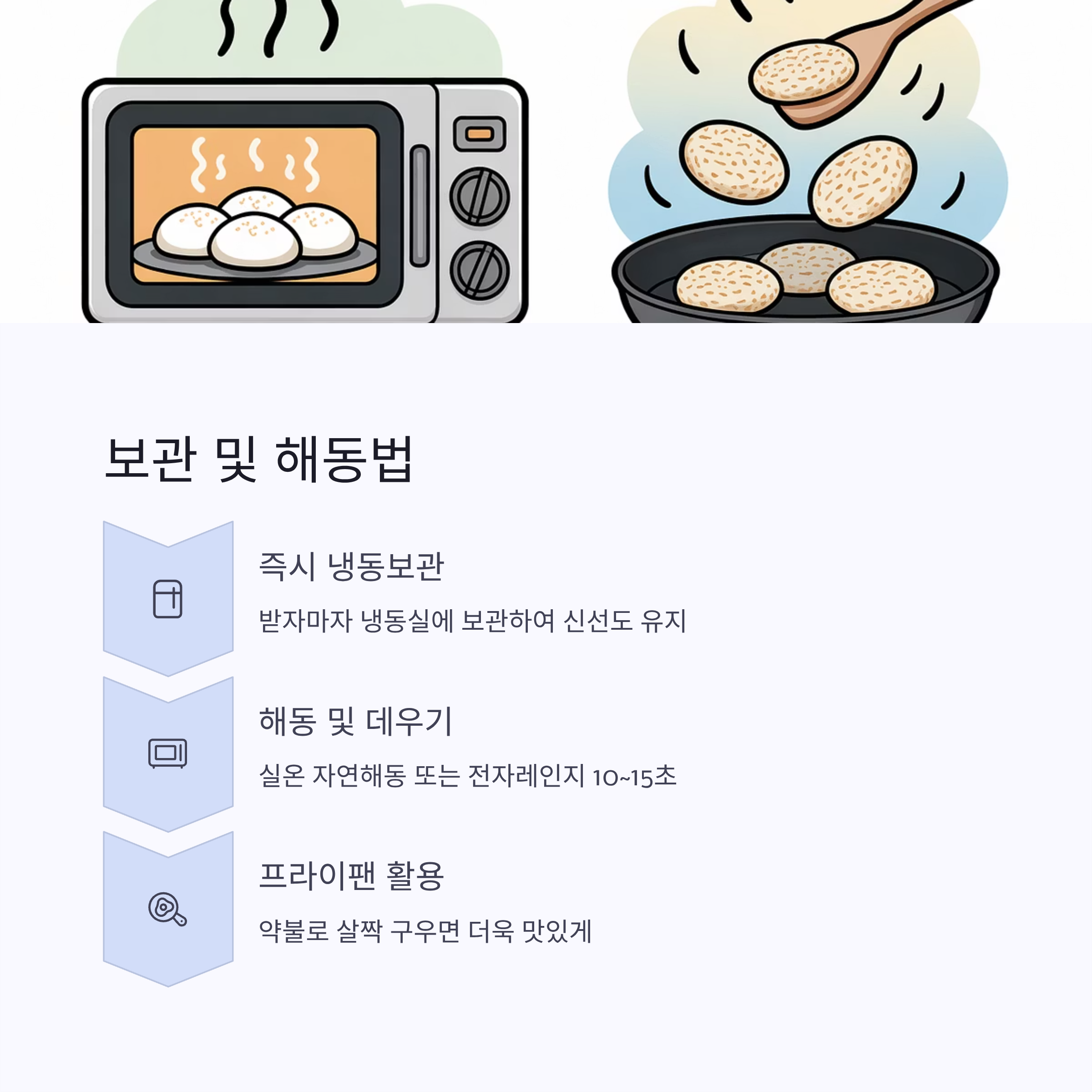 받은 떡은 즉시 냉동 보관이 필수입니다. 먹기 직전 실온 자연 해동이나 전자레인지에 10~15초 데우면 최상의 쫄깃함을 경험할 수 있습니다. 프라이팬에 약불로 살짝 구워도 맛이 훨씬 살아납니다.