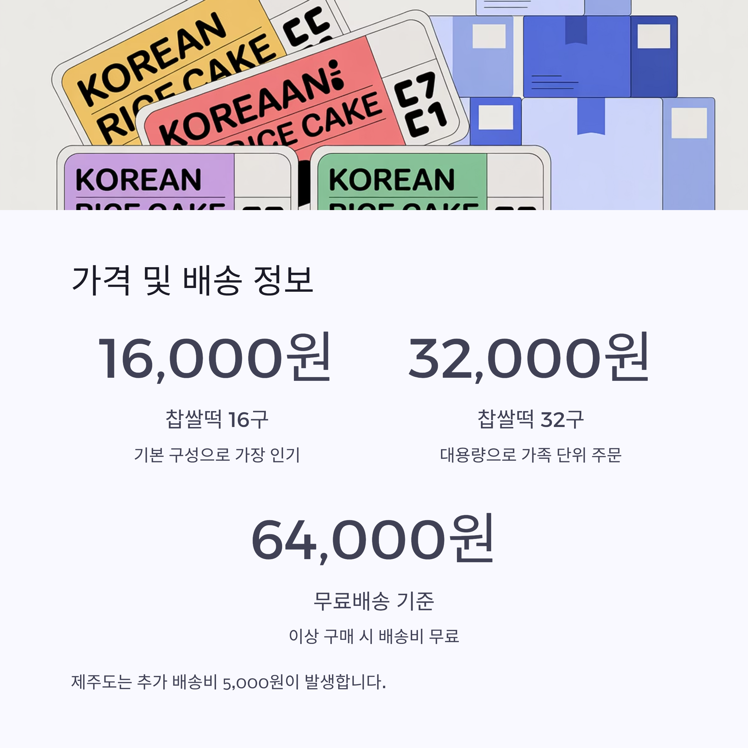 - 가격: 찹쌀떡 16구 약 16,000원, 32구 약 32,000원, 기타 떡 종류 다양