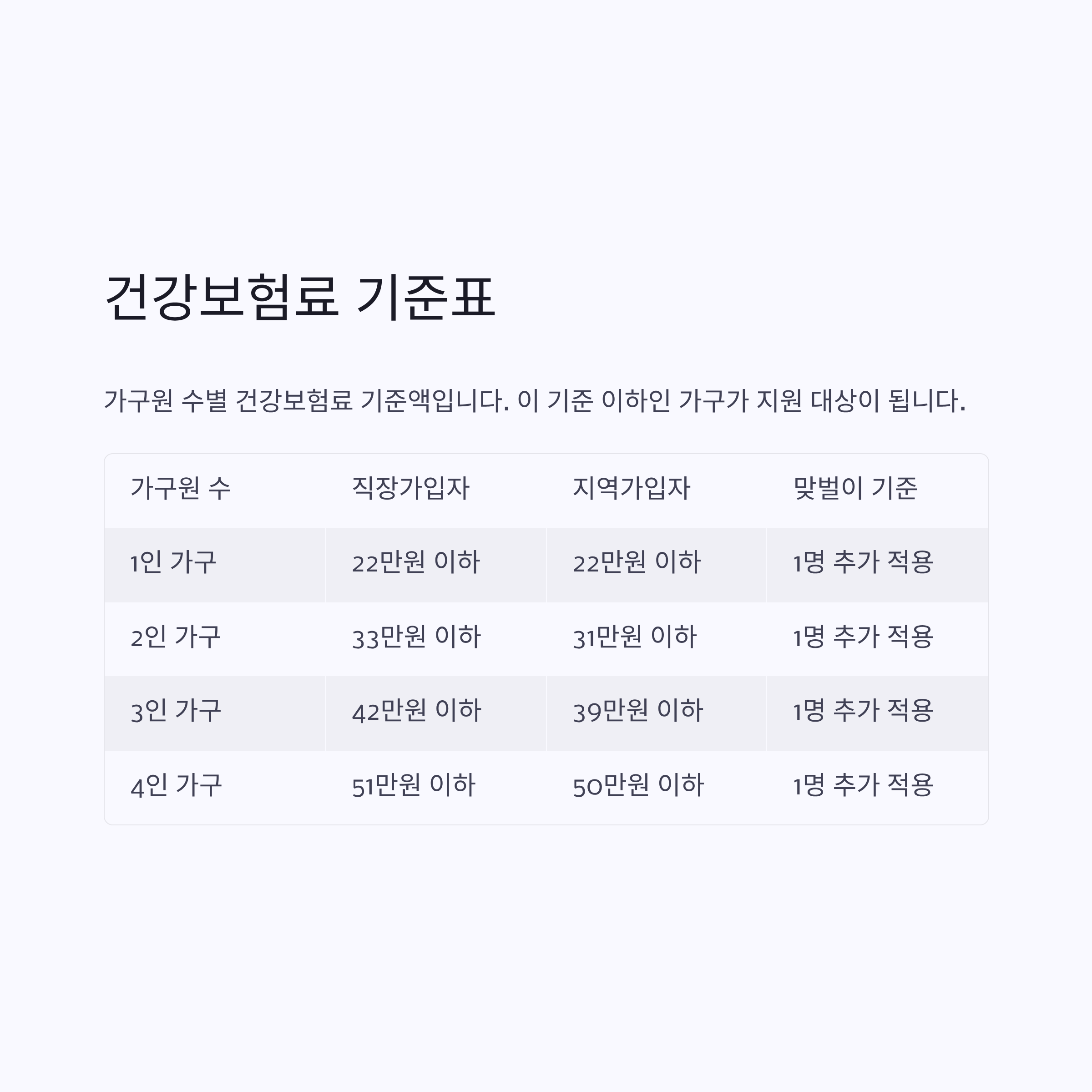 아래 표는 가구원 수별 건강보험료 기준액으로, 이 기준 이하인 가구가 지원 대상입니다.