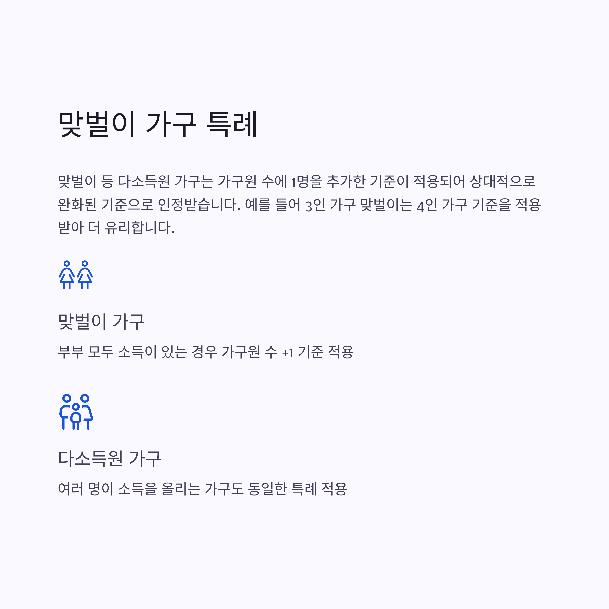 맞벌이 등 다소득원 가구는 가구원 수에 1명을 추가한 기준이 적용되어 상대적으로 더 완화된 기준으로 인정받습니다.