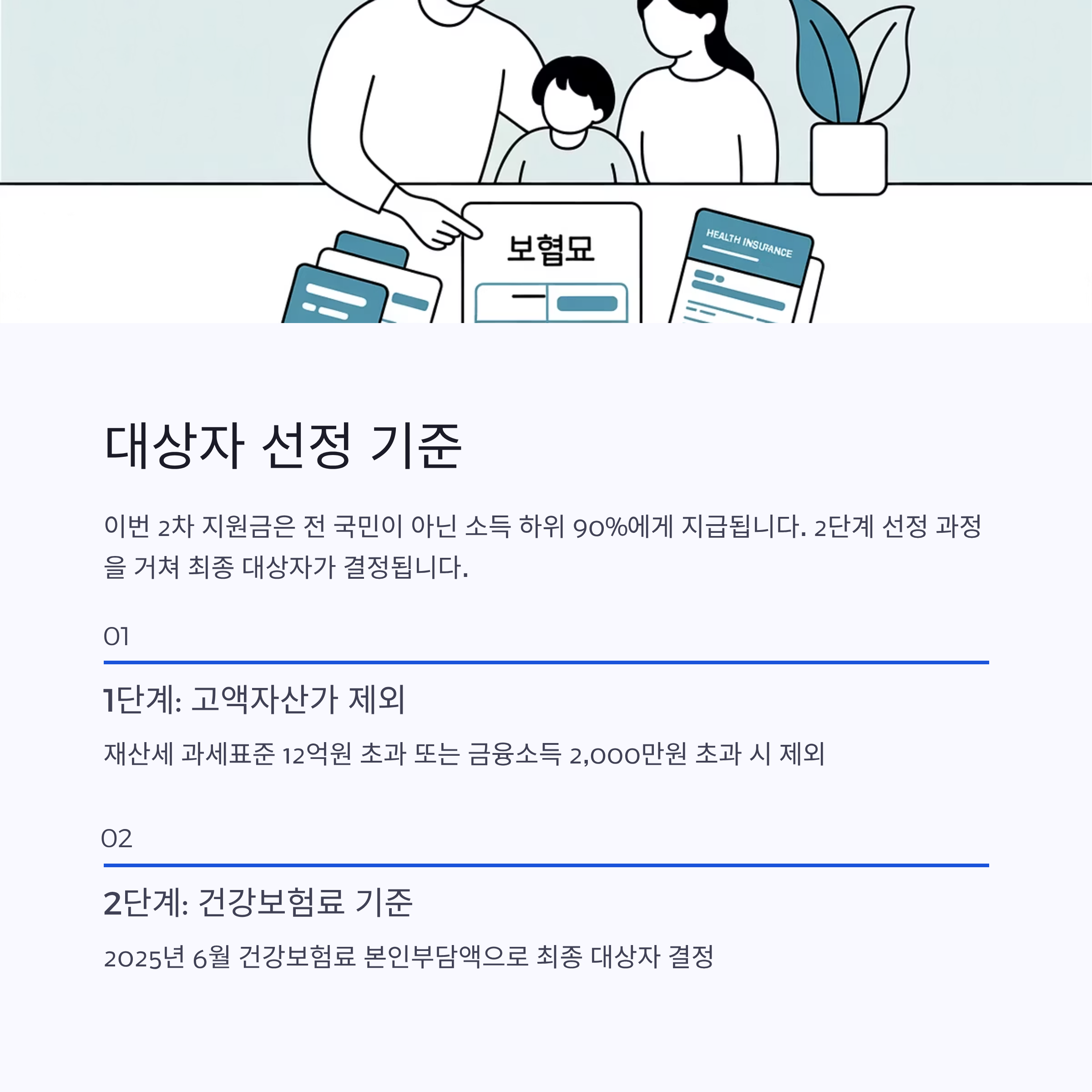 이번 2차는 전 국민 대상이 아니라 소득 하위 90%에게 지급됩니다. 1단계로 가구 재산세 과세표준 합계액이 12억 원 초과이거나 금융소득이 2,000만 원 초과하는 고액자산가는 지급 대상에서 제외합니다. 2단계는 2025년 6월 건강보험료 본인 부담액 합산으로 최종 대상자가 결정됩니다.