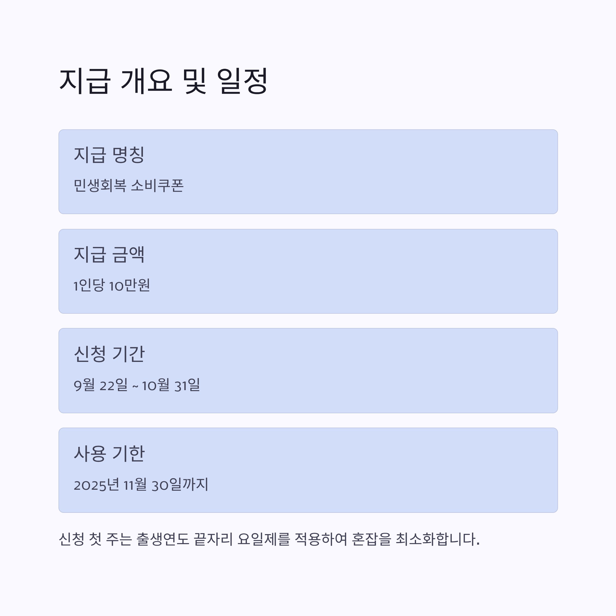2025년 2차 민생지원금은 ‘민생회복 소비쿠폰’ 명칭으로 9월 22일부터 10월 31일까지 신청받습니다. 1인당 10만원씩 지급하며, 사용기한은 2025년 11월 30일까지입니다. 지급은 순차적으로 이루어지고 신청 첫 주는 출생연도 끝자리 요일제가 적용돼 혼잡을 최소화합니다.