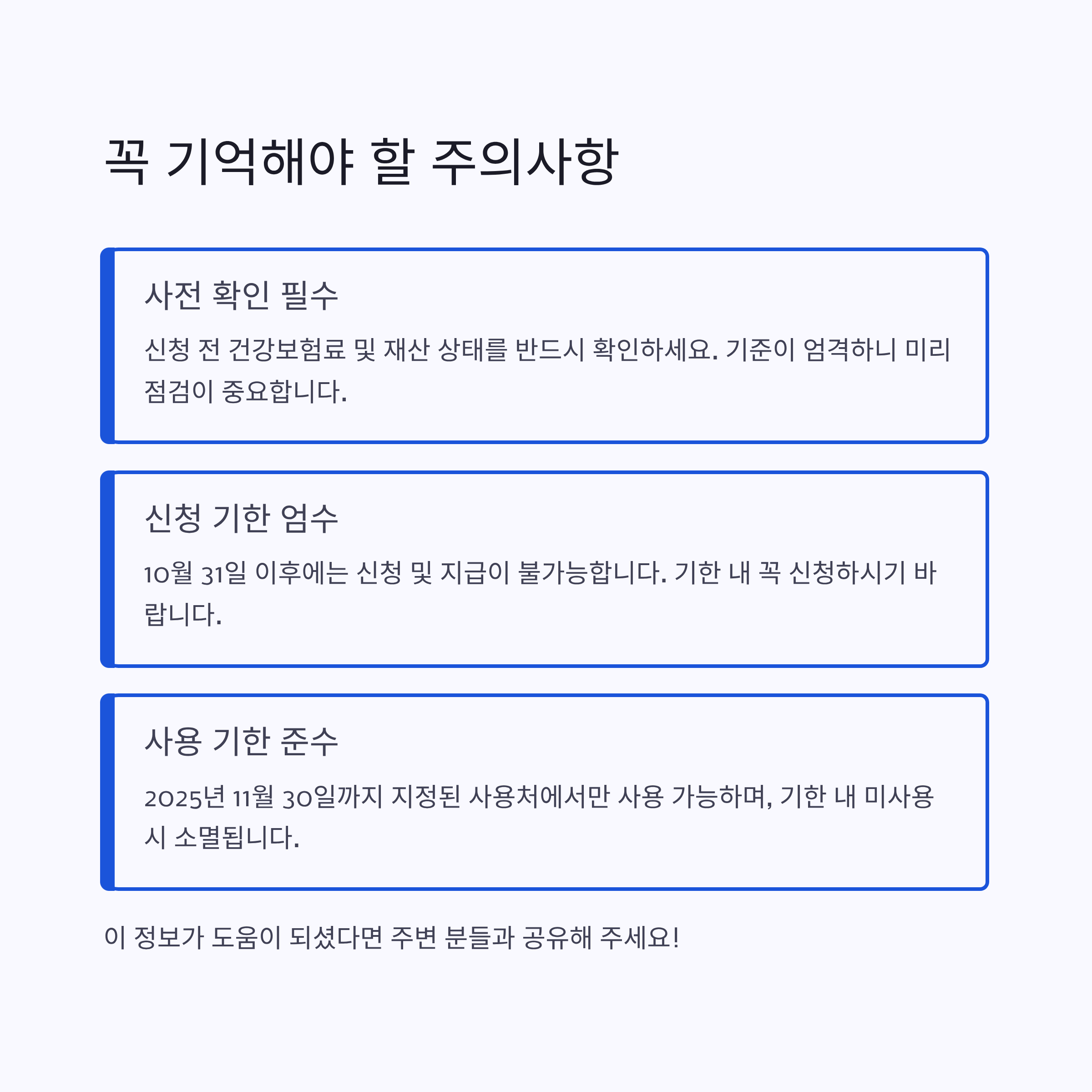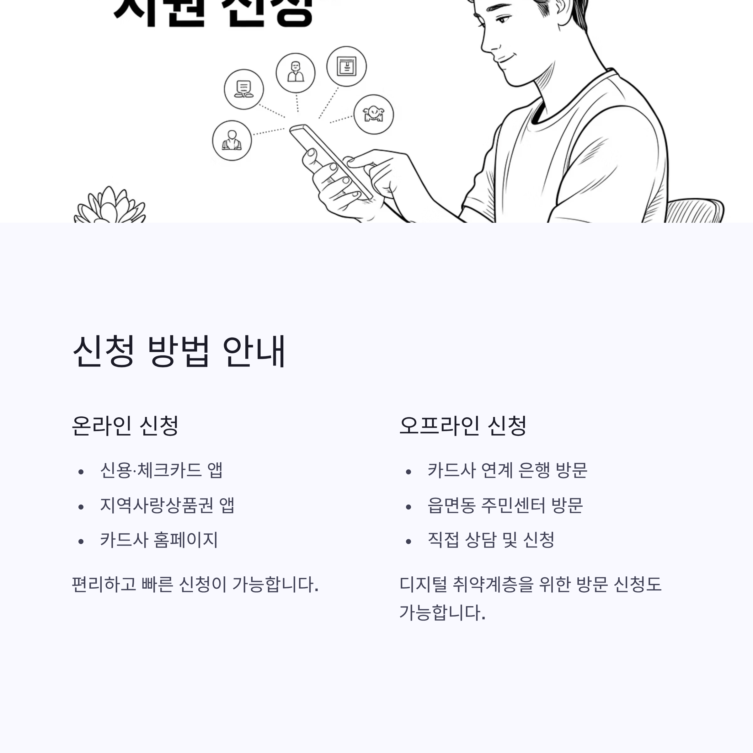 온라인은 신용·체크카드 앱, 지역사랑상품권 앱에서 신청 가능하며, 오프라인은 해당 카드사 연계 은행 또는 주민센터에서 신청할 수 있습니다. 지원금은 지정된 사용처에서만 사용 가능하며 기한 내에 사용하지 않으면 소멸합니다.