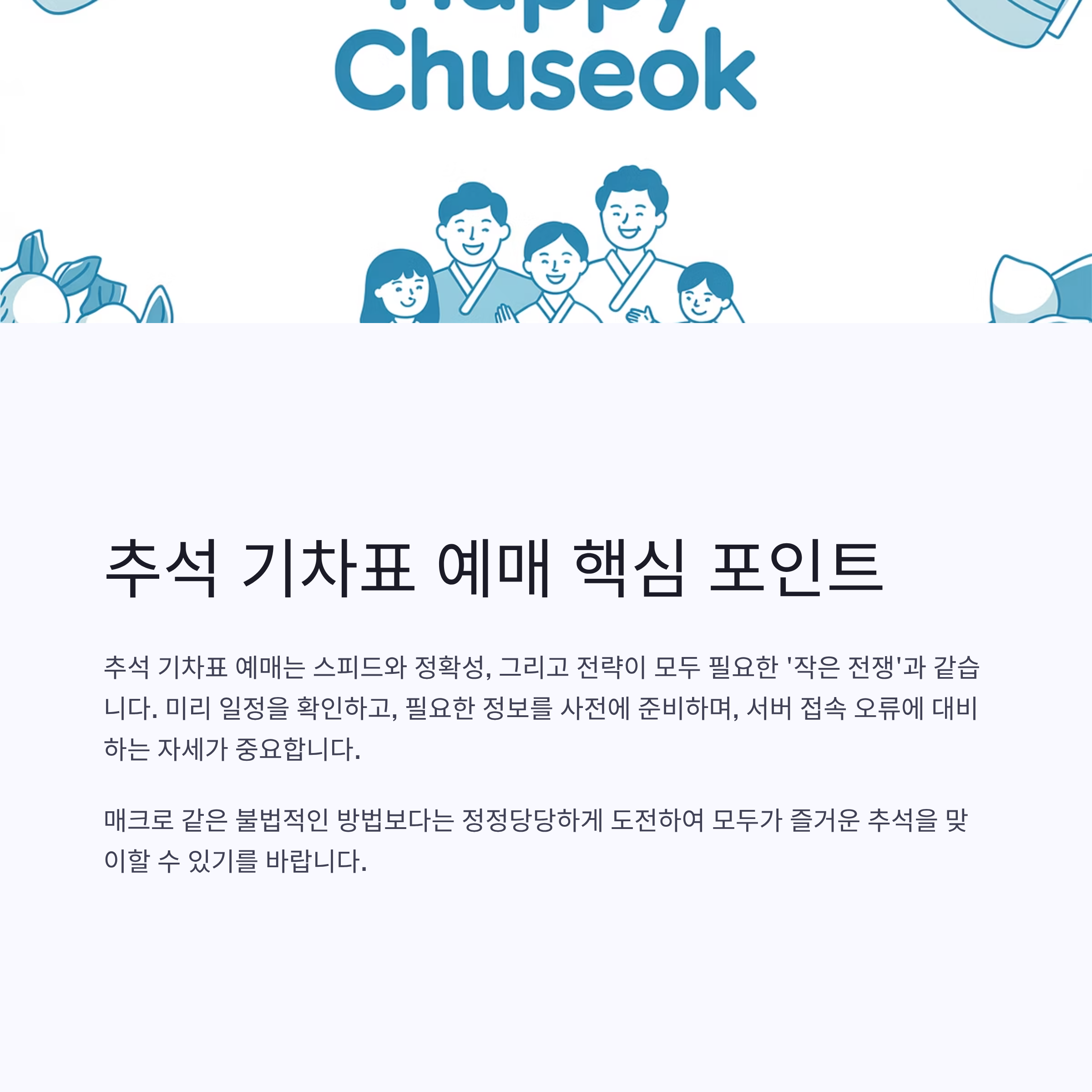 추석 기차표 예매는 스피드와 정확성, 그리고 전략이 모두 필요한 '작은 전쟁'과 같습니다. 미리 일정을 확인하고, 필요한 정보를 사전에 준비하며, 서버 접속 오류에 대비하는 자세가 중요합니다. 매크로 같은 불법적인 방법보다는 정정당당하게 도전하여 모두가 즐거운 추석을 맞이할 수 있기를 바랍니다.